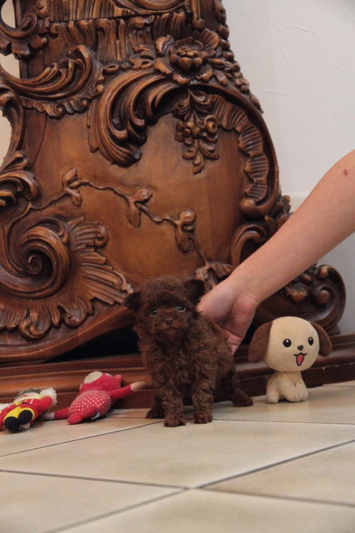 ★完全に小さいマイクロサイズの女の子★ 成犬時の予想サイズが1kg位のマイクロティーカップサイズの女の子です。 ティーカップサイズの子特有の立耳ちゃんです。 成長と共に、耳タブの厚みが出る事、耳タブが大きくなる事、毛が太くコシが出る事などによって、普通の耳のつき方の様に垂れますが、事前にご容赦くださいませ。 もし立耳にしておきたい場合には、トリミングの際に耳の毛を耳縁ギリギリでカットし続けていただければと思います。 顔がとっても可愛くて、目がクリクリしていて大きく、マズルはビックリする位に猫の口元の様にドン詰まりです。 こちらの子は、とても可愛い子なのですが、鼻の色素が薄く、レバーな為(レバーと言ってもピンクでは無く、チョコレート色)通常価格よりお値段を引き下げております。月齢が浅いうちでの撮影となった為、まだこれから、少しずつ濃くなりますが、こげ茶色の鼻と想像頂ければと思います。 健康上や生活上には一切支障も無いのでご安心頂ければと思います。 この家系は、チビチビ家系でな為、予想より小さく収まってしまう可能性もございます。 性格は甘えん坊さんで人が大好きなのと、オモチャが意外と好きで、一人遊びがとても上手な子です。 人や犬に対してとても優しく接する事の出来る子です。 1回目のワクチン接種と健康診断が終わっており、すぐにお引き渡しが可能です。 飼育の事やトリミングの事など、ご不安な点も、子犬の購入後の手続きの際に一つずつ丁寧にご指導いたしております。 ご安心して、お気軽にお問い合わせ下さいませ。 表示価格は現金特価となっております。 カードでお支払いのお客様は510,300円(税抜472,500円)でございます。 当社で飼育の際に実際に使用しているゲージやトイレなどの生活用品の一式がセットになって37,800円の飼育セットの御用意がございます。 犬種ごとに選択いただくゲージも違いますので、初めての方は、ワンちゃんの購入の際に、同時に飼育セットをお持ち帰りいただく事をオススメしております。 ワンちゃんも使い慣れているので、不安無く新しい生活がスタート出来ると思います。 |