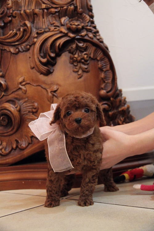 ★本気で気に入ってくださった方に譲ります★ 成犬時の予想サイズ3.5kg位予想の女の子です。 目がクリックリで丸く大きく、顔が全体的にかなり可愛くて、毛量、顔のパーツの配置など、とにかく完璧です!! 毛色はディープレッドで、毛量がかなりあるので、一回り以上大きく見えると思いますが、持ったら分かるギュッと詰めた感じじのトイサイズの女の子です。 当社の台雌として残そうと思っていますが、どうしてもほしい!!という方が居りましたら検討いたします。 1回目のワクチン接種と健康診断が終わっており、すぐにお引き渡しが可能です。 飼育の事やトリミングの事など、ご不安な点も、子犬の購入後の手続きの際に一つずつ丁寧にご指導いたしております。 ご安心して、お気軽にお問い合わせ下さいませ。 表示価格は現金特価となっております。 カードでお支払いのお客様は567,000円(税抜525,000円)でございます。 当社で飼育の際に実際に使用しているゲージやトイレなどの生活用品の一式がセットになって37,800円の飼育セットの御用意がございます。 犬種ごとに選択いただくゲージも違いますので、初めての方は、ワンちゃんの購入の際に、同時に飼育セットをお持ち帰りいただく事をオススメしております。 ワンちゃんも使い慣れているので、不安無く新しい生活がスタート出来ると思います。 |