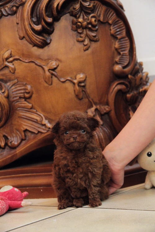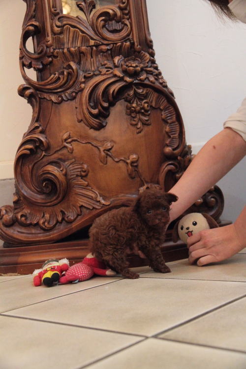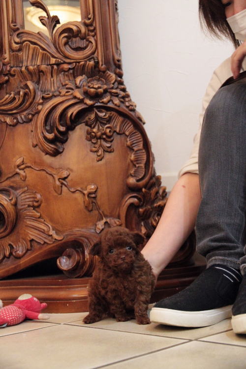 ★完全に小さいマイクロサイズの女の子★ 成犬時の予想サイズが1kg位のマイクロティーカップサイズの女の子です。 ティーカップサイズの子特有の立耳ちゃんです。 成長と共に、耳タブの厚みが出る事、耳タブが大きくなる事、毛が太くコシが出る事などによって、普通の耳のつき方の様に垂れますが、事前にご容赦くださいませ。 もし立耳にしておきたい場合には、トリミングの際に耳の毛を耳縁ギリギリでカットし続けていただければと思います。 顔がとっても可愛くて、目がクリクリしていて大きく、マズルはビックリする位に猫の口元の様にドン詰まりです。 こちらの子は、とても可愛い子なのですが、鼻の色素が薄く、レバーな為(レバーと言ってもピンクでは無く、チョコレート色)通常価格よりお値段を引き下げております。月齢が浅いうちでの撮影となった為、まだこれから、少しずつ濃くなりますが、こげ茶色の鼻と想像頂ければと思います。 健康上や生活上には一切支障も無いのでご安心頂ければと思います。 この家系は、チビチビ家系でな為、予想より小さく収まってしまう可能性もございます。 性格は甘えん坊さんで人が大好きなのと、オモチャが意外と好きで、一人遊びがとても上手な子です。 人や犬に対してとても優しく接する事の出来る子です。 1回目のワクチン接種と健康診断が終わっており、すぐにお引き渡しが可能です。 飼育の事やトリミングの事など、ご不安な点も、子犬の購入後の手続きの際に一つずつ丁寧にご指導いたしております。 ご安心して、お気軽にお問い合わせ下さいませ。 表示価格は現金特価となっております。 カードでお支払いのお客様は510,300円(税抜472,500円)でございます。 当社で飼育の際に実際に使用しているゲージやトイレなどの生活用品の一式がセットになって37,800円の飼育セットの御用意がございます。 犬種ごとに選択いただくゲージも違いますので、初めての方は、ワンちゃんの購入の際に、同時に飼育セットをお持ち帰りいただく事をオススメしております。 ワンちゃんも使い慣れているので、不安無く新しい生活がスタート出来ると思います。 |