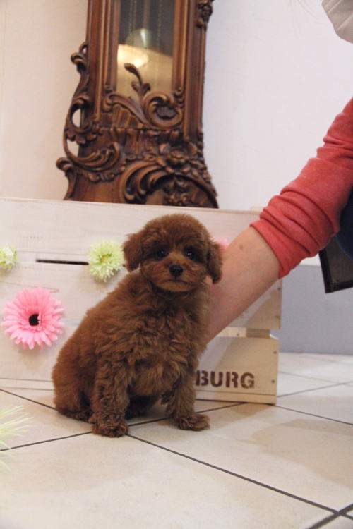 ★色が濃くて可愛らしい男の子です★ 成犬時の予想サイズが2.6kg位のムクムクのタイニーサイズを予想している男の子です。 毛量が抜群で、毛を掻き分けても地肌の見えないボリューム。 毛色は濃いレンガ色のディープレッドです。 鼻やアイラインなど、色素がとても濃い黒です。 人懐こい子で、尻尾をピコピコ振ってスタッフに駆け寄る姿がとてもかわいいです!! 欠点やミスカラー等はありません。 1回目のワクチン接種と健康診断が終わっており、いつでもお引き渡しが可能です。 飼育の事やトリミングの事など、ご不安な点も、子犬の購入後の手続きの際に一つずつ丁寧にご指導いたしております。 ご安心して、お気軽にお問い合わせ下さいませ。 表示価格は現金特価となっております。 カードでお支払いのお客様は254,100円(税抜231,000円)でございます。 当社で飼育の際に実際に使用しているゲージやトイレなどの生活用品の一式がセットになって37,800円の飼育セットの御用意がございます。 犬種ごとに選択いただくゲージも違いますので、初めての方は、ワンちゃんの購入の際に、同時に飼育セットをお持ち帰りいただく事をオススメしております。 ワンちゃんも使い慣れているので、不安無く飼育を開始いただけると思います。 |
